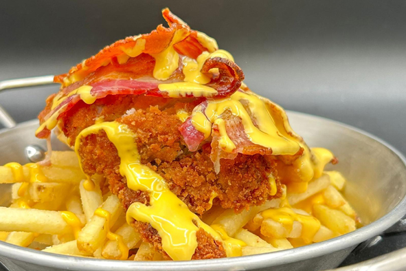 Patapollo: Basket composto da patatine fritte con pollo fritto, bacon e cheddar.